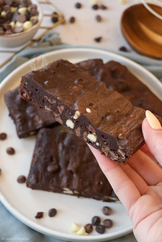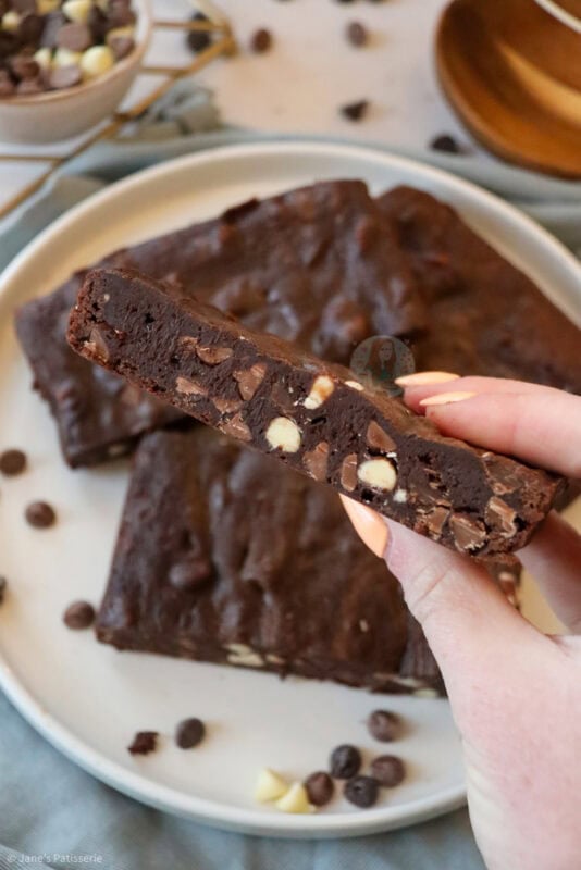 A deliciously chocolatey and easy chocolate fudge brownie recipe with triple chocolate chips, perfect for serving 4-6 people. Thick, fudgy and HEAVENLY.